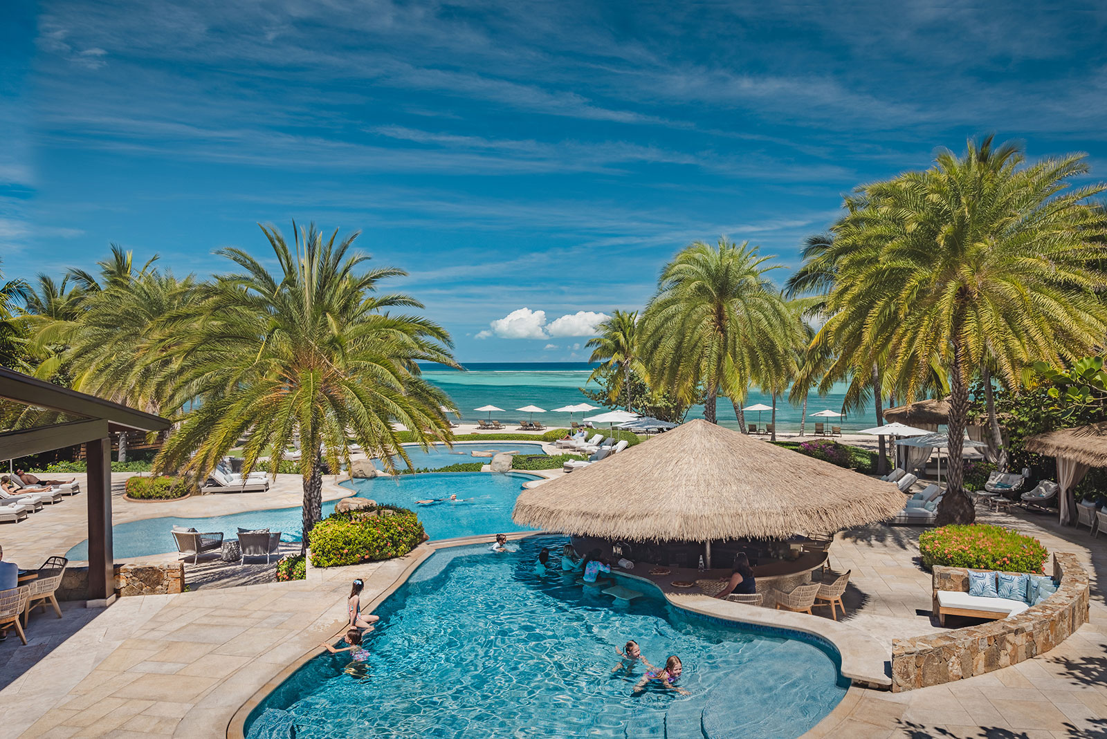 The social center of Oil Nut Bay, offering dining options, three pools, a swim-up bar, and areas to relax and gather.